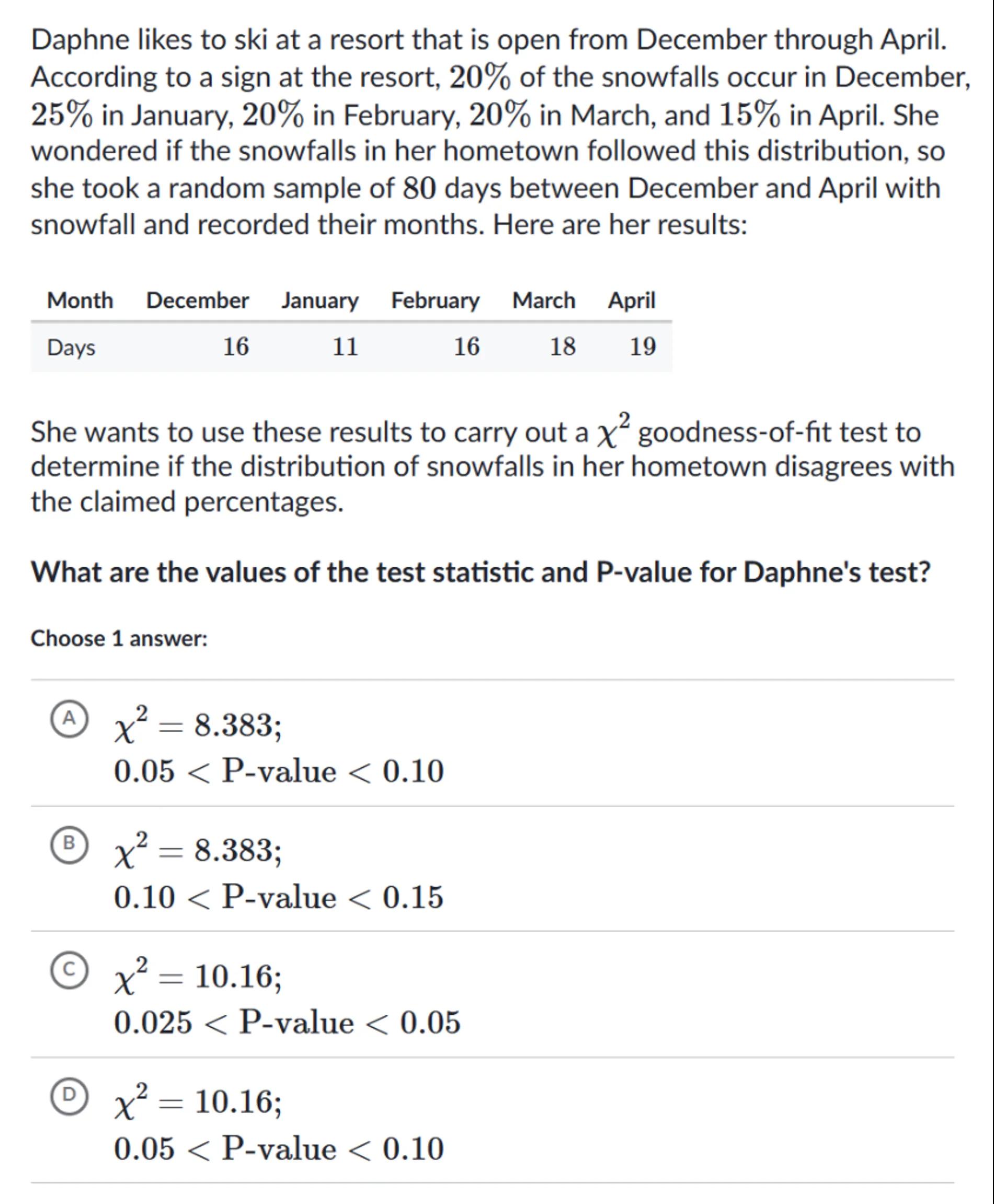 Daphne likes to ski at a resort that is open from December through April. According to a sign at the resort, of the snowfalls occur in December, in January, in February, in March, and in April. She wondered if the snowfalls in her hometown followed this distribution, so she took a random sample of 80 days between December and April with snowfall and recorded their months. Here are her results: