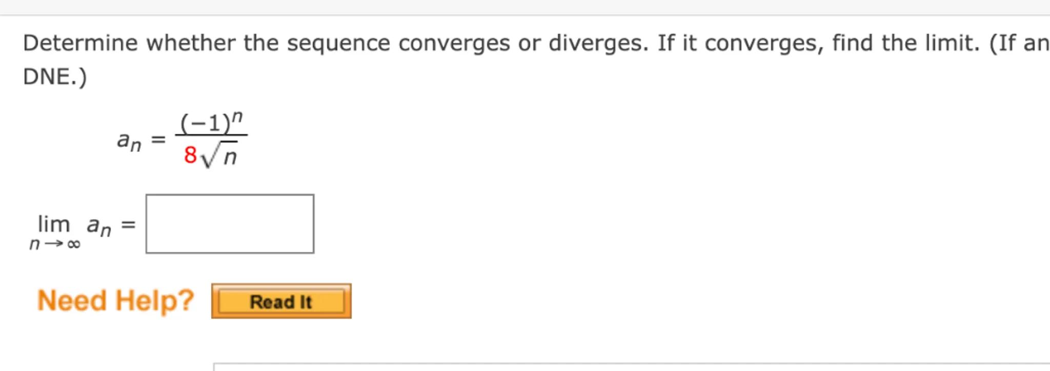 Determine whether the sequence converges or diverges. If it converges, find the limit. (If an DNE.)