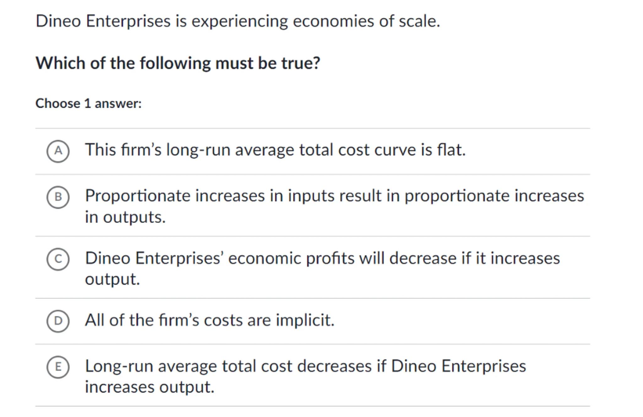 (E) Long-run average total cost decreases if Dineo Enterprises increases output.