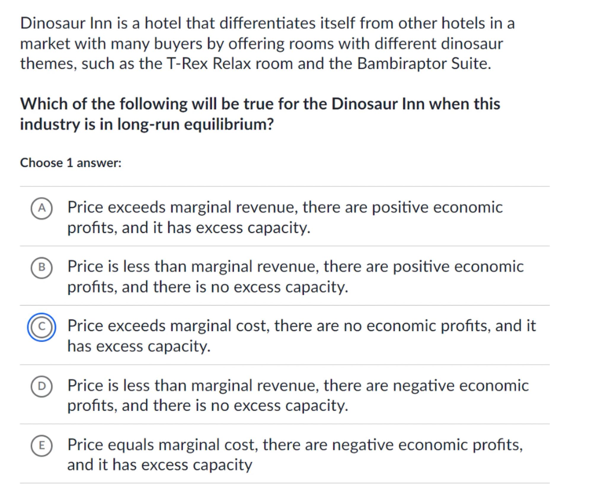 (C) Price exceeds marginal cost, there are no economic profits, and it has excess capacity.