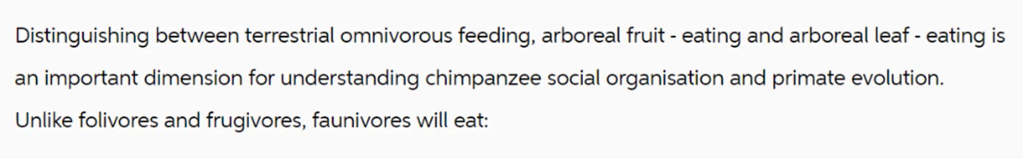 Distinguishing between terrestrial omnivorous feeding, arboreal fruit - eating and arboreal leaf - eating is an important dimension for understanding chimpanzee social organisation and primate evolution. Unlike folivores and frugivores, faunivores will eat: