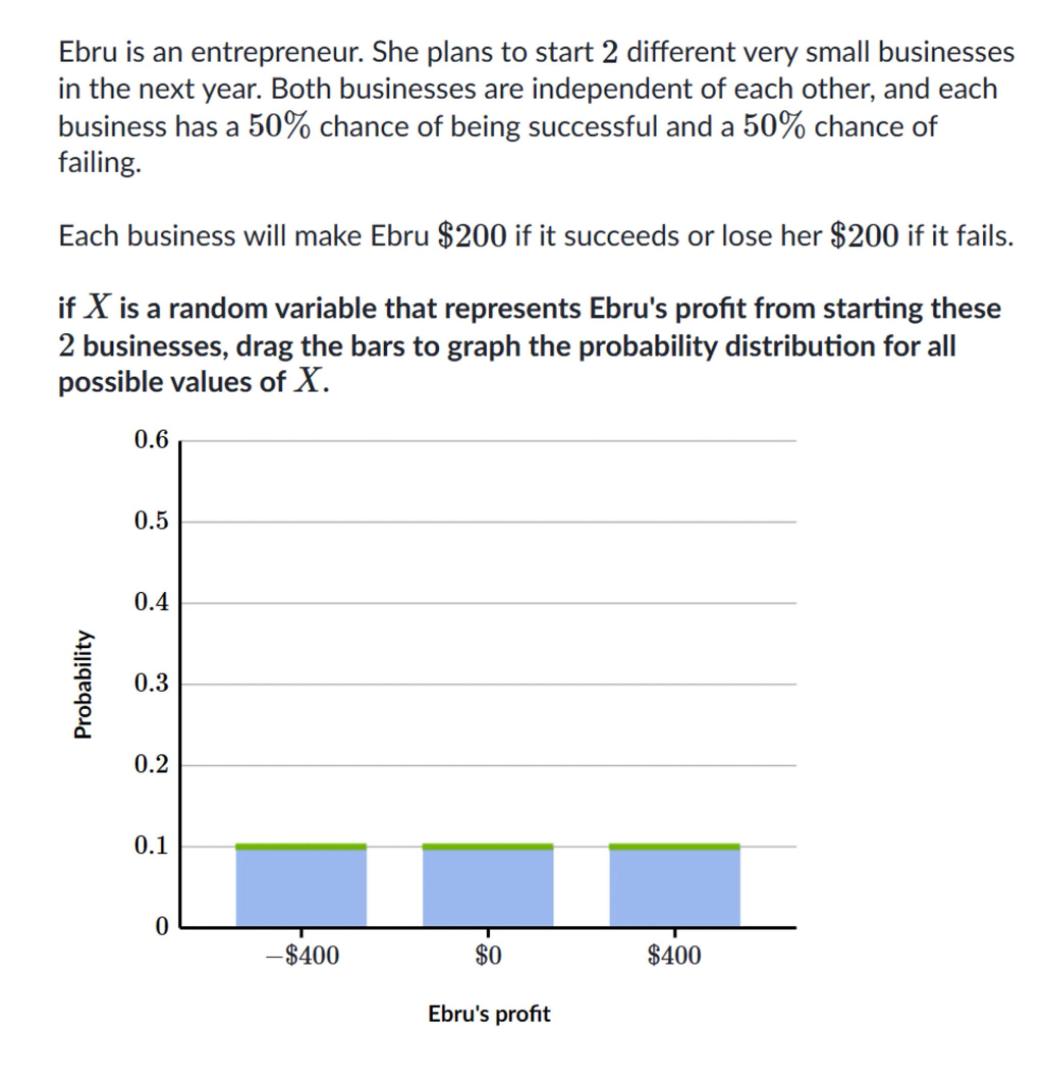if is a random variable that represents Ebru's profit from starting these 2 businesses, drag the bars to graph the probability distribution for all possible values of .