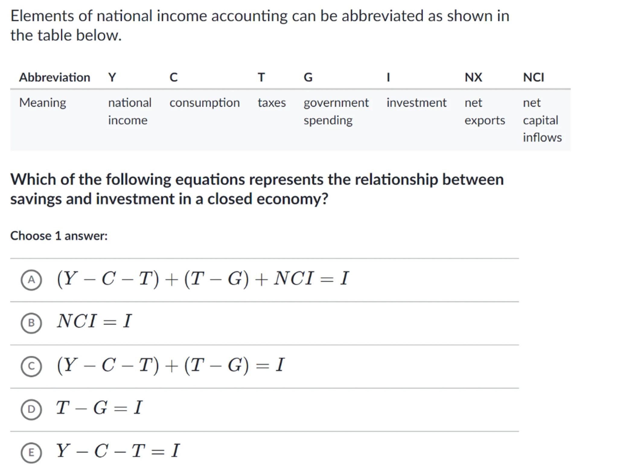 Elements of national income accounting can be abbreviated as shown in the table below.