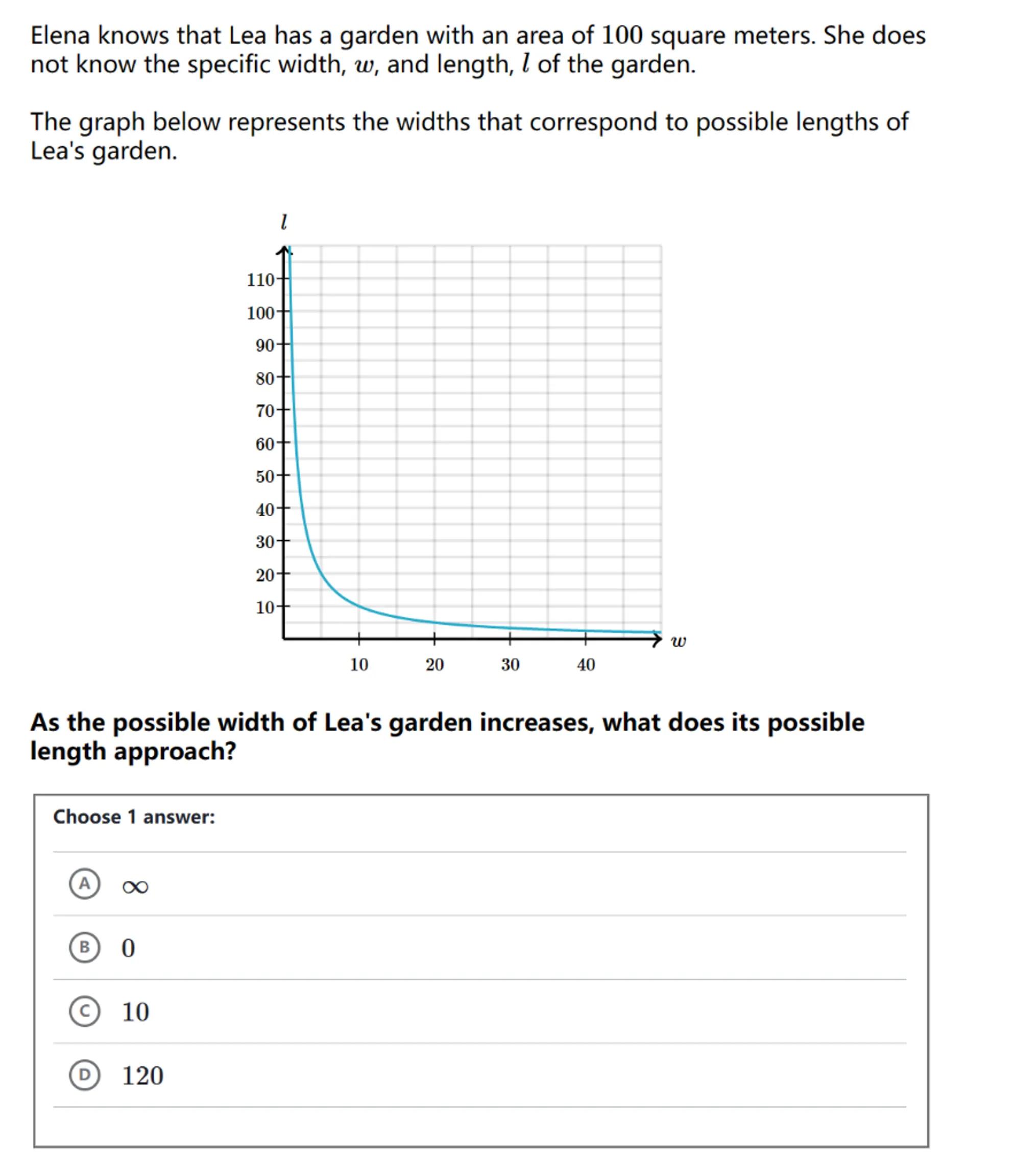 Elena knows that Lea has a garden with an area of 100 square meters. She does not know the specific width, , and length, of the garden.