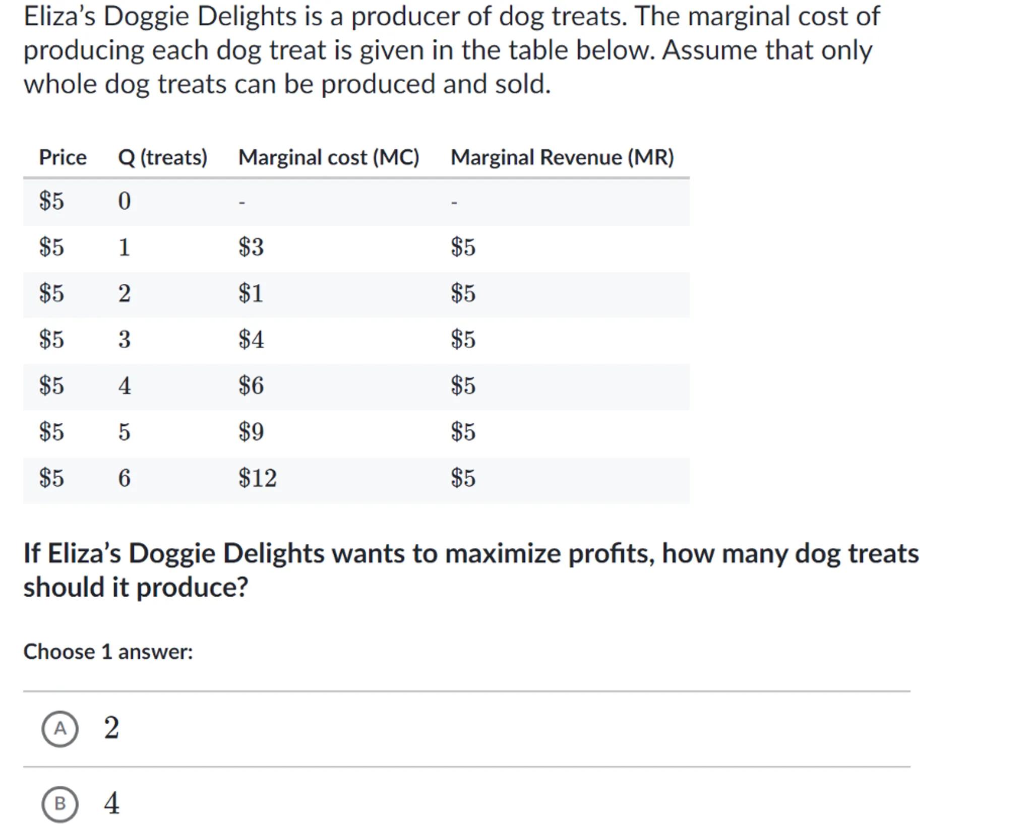 Eliza's Doggie Delights is a producer of dog treats. The marginal cost of producing each dog treat is given in the table below. Assume that only whole dog treats can be produced and sold.