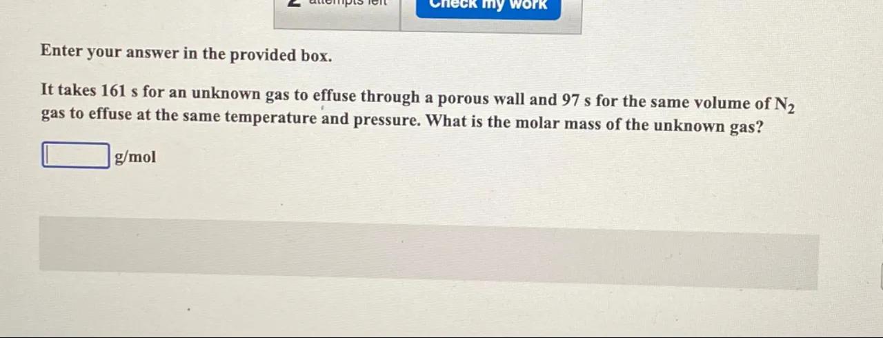 It takes for an unknown gas to effuse through a porous wall and for the same volume of gas to effuse at the same temperature and pressure. What is the molar mass of the unknown gas?