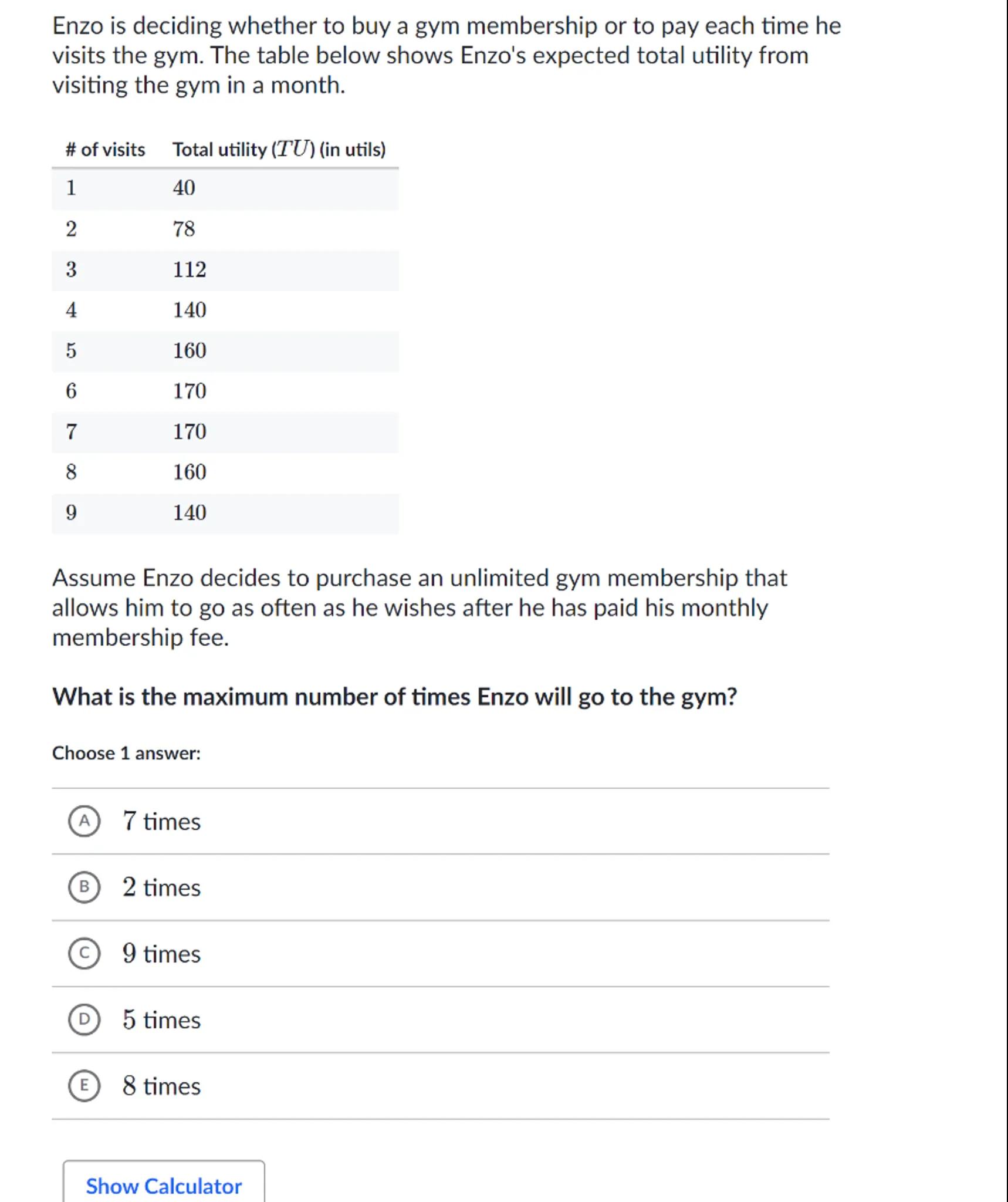 Enzo is deciding whether to buy a gym membership or to pay each time he visits the gym. The table below shows Enzo's expected total utility from visiting the gym in a month.
