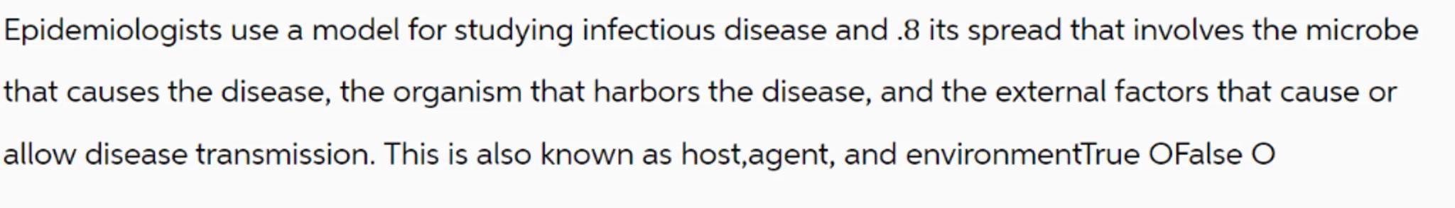 Epidemiologists use a model for studying infectious disease and . 8 its spread that involves the microbe that causes the disease, the organism that harbors the disease, and the external factors that cause or allow disease transmission. This is also known as host,agent, and environmentTrue OFalse