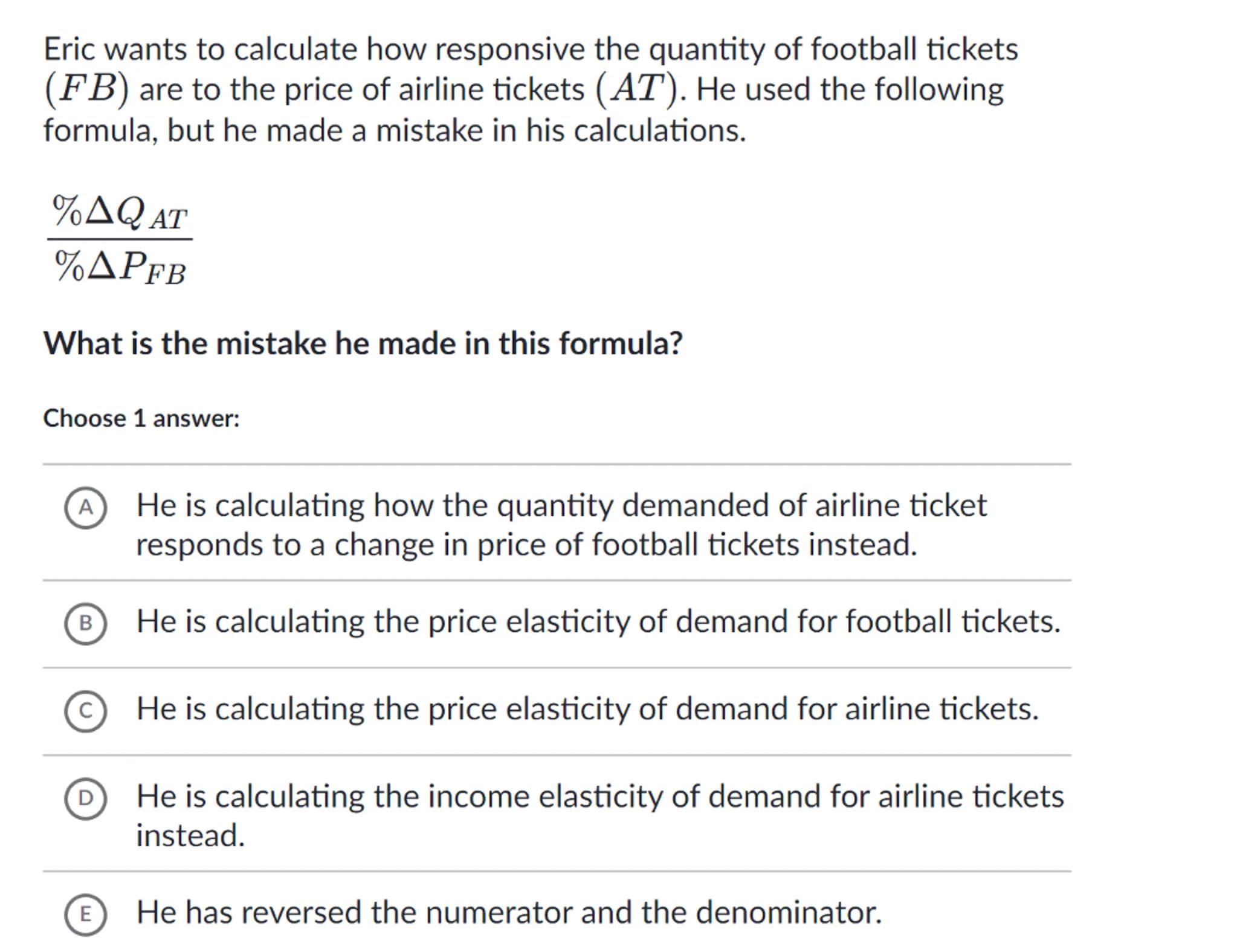 (A) He is calculating how the quantity demanded of airline ticket responds to a change in price of football tickets instead.