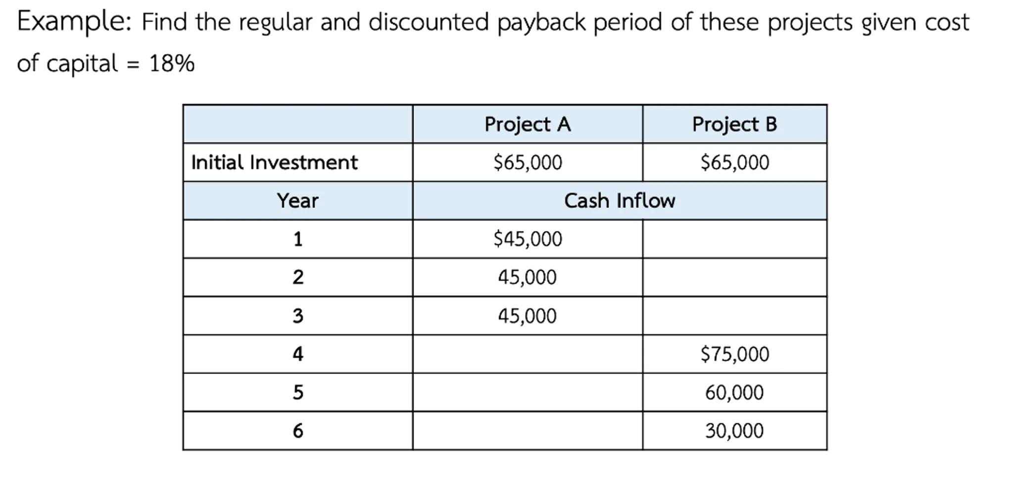 Example: Find the regular and discounted payback period of these projects given cost of capital =