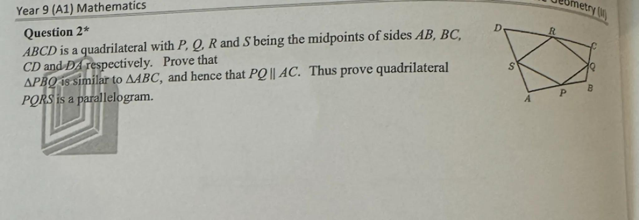 is a quadrilateral with and being the midpoints of sides , and respectively. Prove that is similar to , and hence that . Thus prove quadrilateral is a parallelogram.