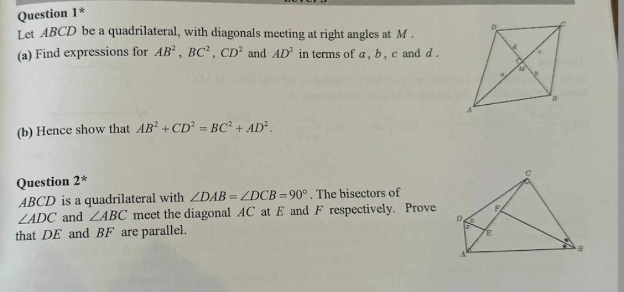 Let be a quadrilateral, with diagonals meeting at right angles at .