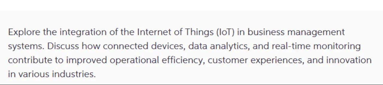 That's a great topic to explore! Integrating the Internet of Things (IoT) in business management systems can indeed lead to improved operational efficiency, enhanced customer experiences, and foster innovation in various industries. Connected devices allow for real-time monitoring and data analytics, enabling businesses to make informed decisions and streamline processes. It's fascinating to see how technology is transforming the way businesses operate. Let's delve deeper into this topic and discuss its impact on different industries.Not the question you are looking for? Ask here!