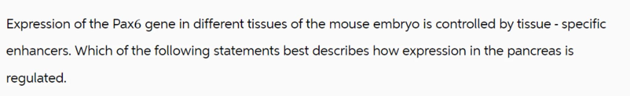 Expression of the Pax6 gene in different tissues of the mouse embryo is controlled by tissue - specific enhancers. Which of the following statements best describes how expression in the pancreas is regulated.