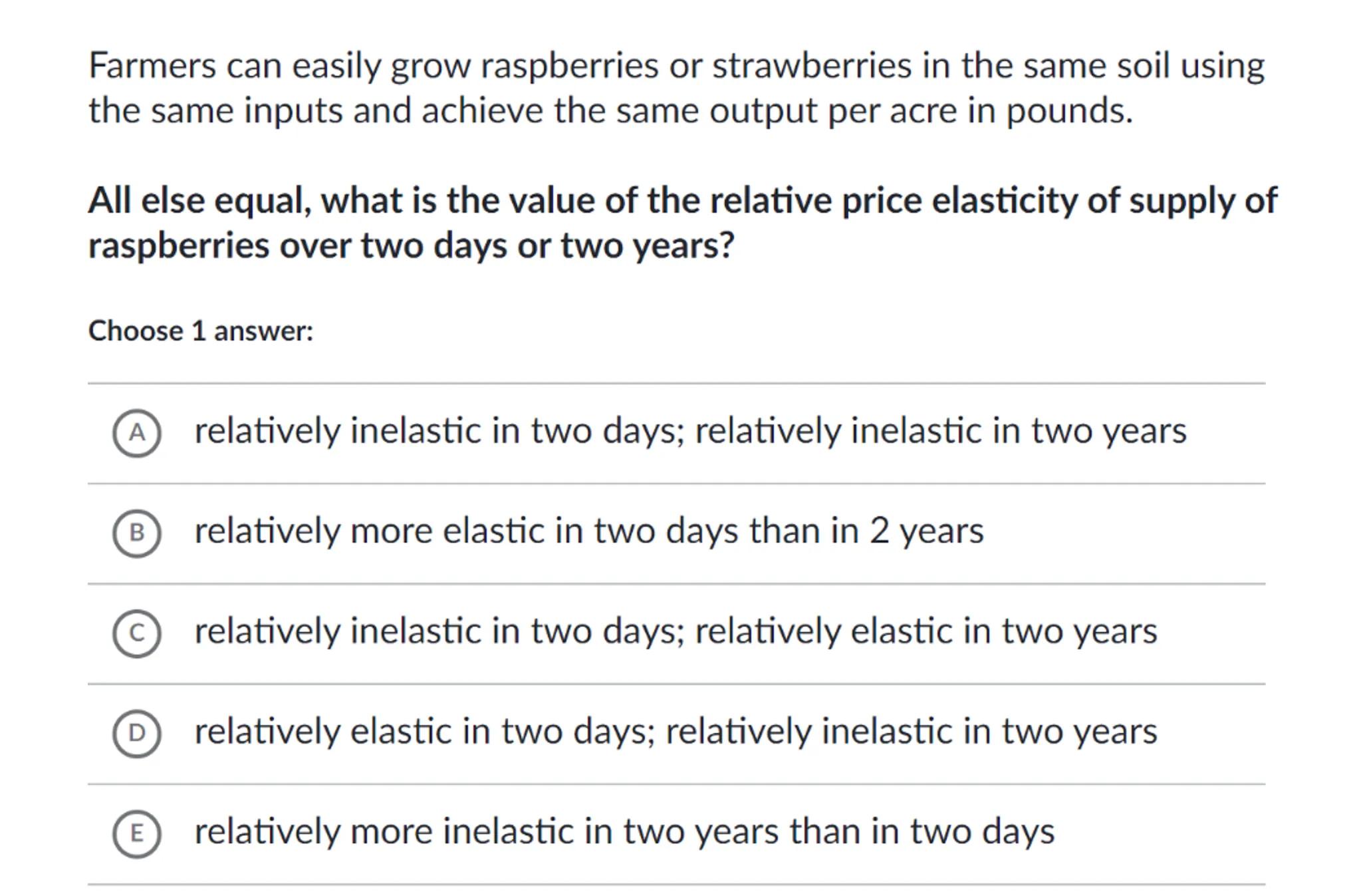 All else equal, what is the value of the relative price elasticity of supply of raspberries over two days or two years?