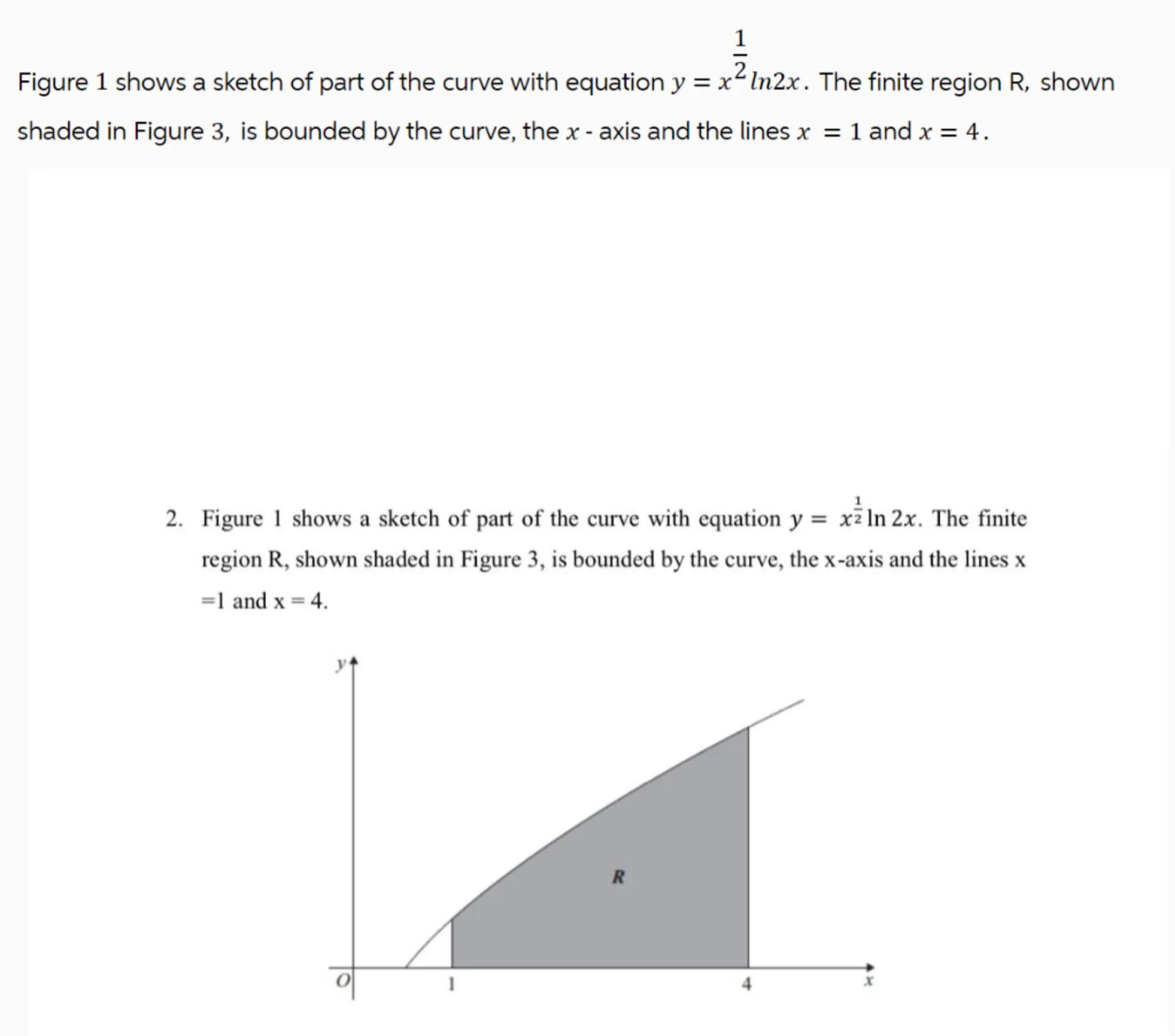 2. Figure 1 shows a sketch of part of the curve with equation . The finite region , shown shaded in Figure 3, is bounded by the curve, the -axis and the lines and .