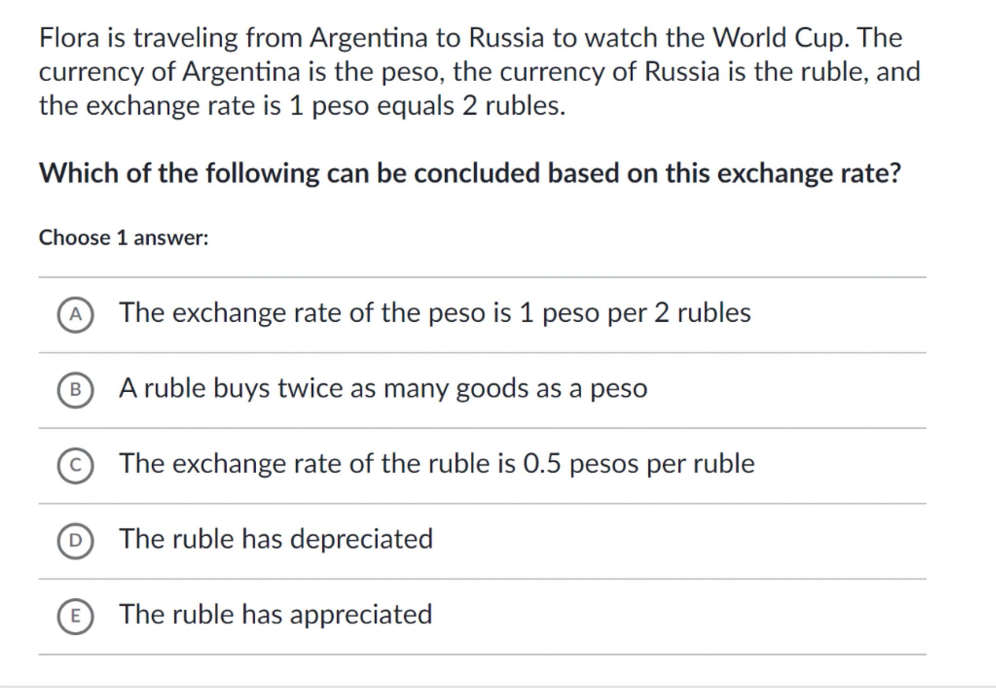 (A) The exchange rate of the peso is 1 peso per 2 rubles