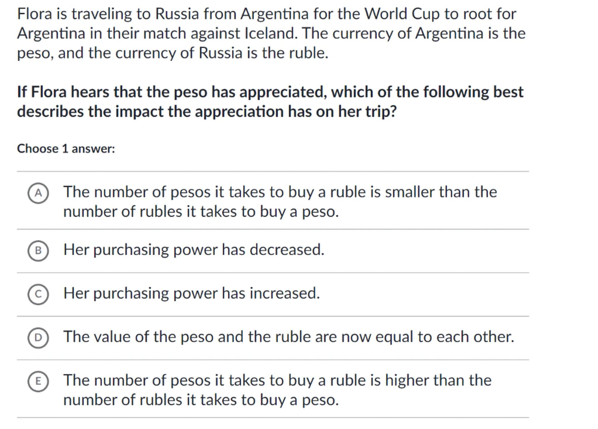 If Flora hears that the peso has appreciated, which of the following best describes the impact the appreciation has on her trip?