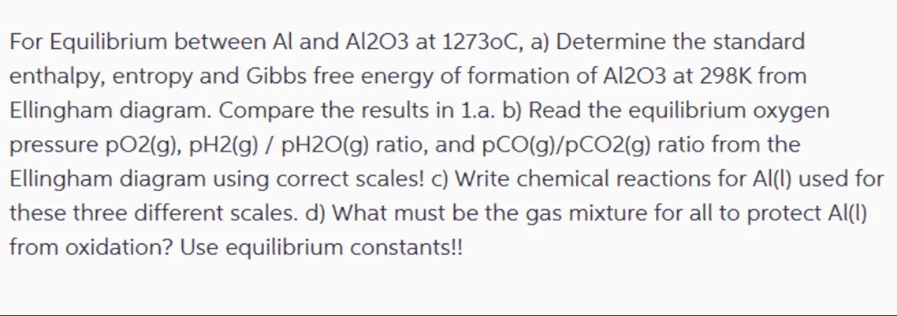 For Equilibrium between and at , a) Determine the standard enthalpy, entropy and Gibbs free energy of formation of Al2O3 at from Ellingham diagram. Compare the results in 1.a. b) Read the equilibrium oxygen pressure ratio, and ratio from the Ellingham diagram using correct scales! c) Write chemical reactions for used for these three different scales. d) What must be the gas mixture for all to protect Al(I) from oxidation? Use equilibrium constants!!