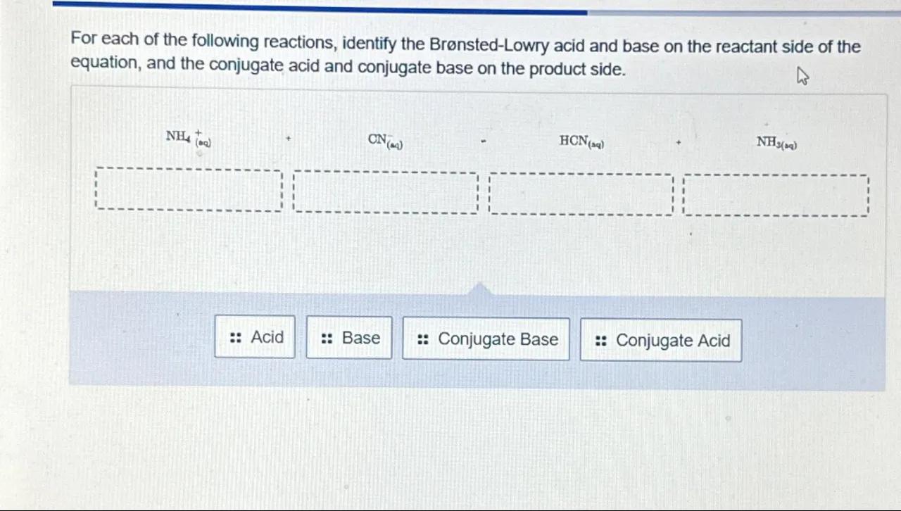 Conjugate Acid: HCN Brønsted-Lowry acids and bases An acid donates a proton to become a conjugate base, and a base accepts a proton to become a conjugate acid. Not the question you are looking for? Ask here!