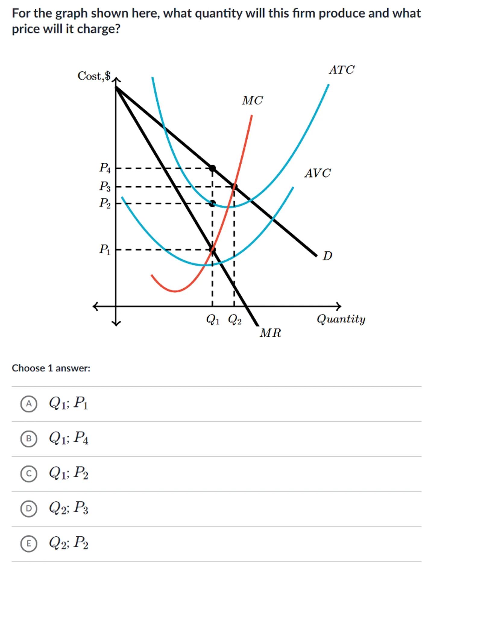 For the graph shown here, what quantity will this firm produce and what price will it charge?