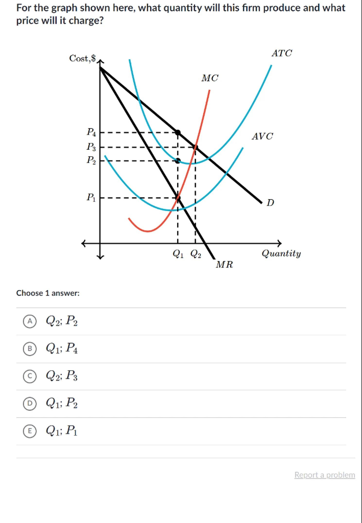 For the graph shown here, what quantity will this firm produce and what price will it charge?