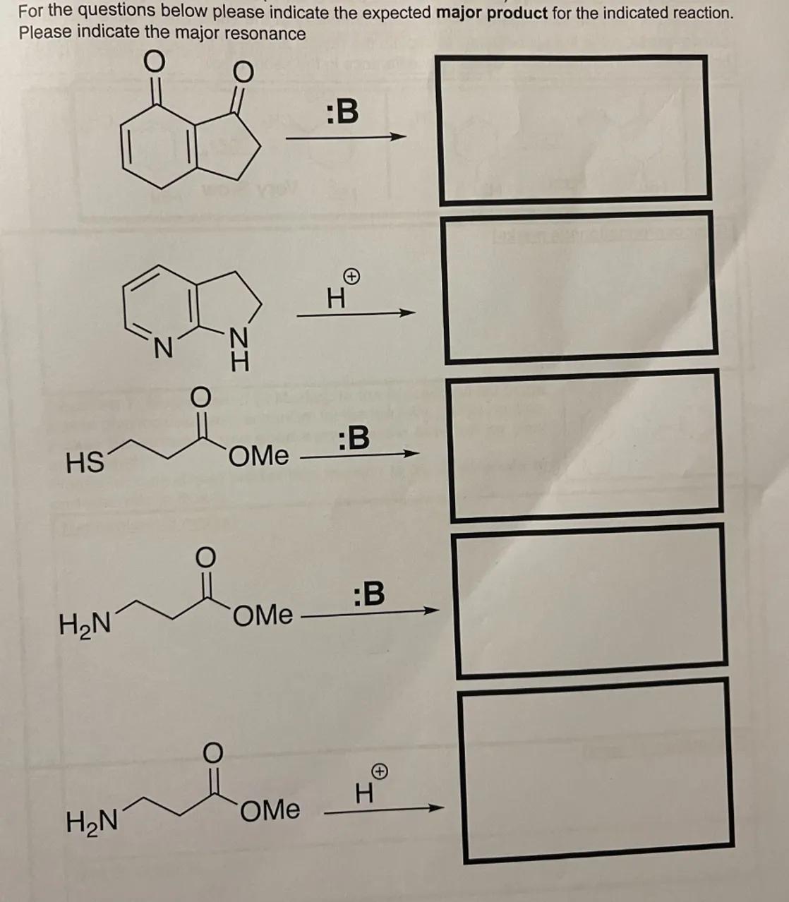 For the questions below please indicate the expected major product for the indicated reaction. Please indicate the major resonance