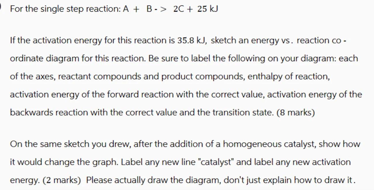 If the activation energy for this reaction is , sketch an energy vs. reaction co ordinate diagram for this reaction. Be sure to label the following on your diagram: each of the axes, reactant compounds and product compounds, enthalpy of reaction, activation energy of the forward reaction with the correct value, activation energy of the backwards reaction with the correct value and the transition state. (8 marks)