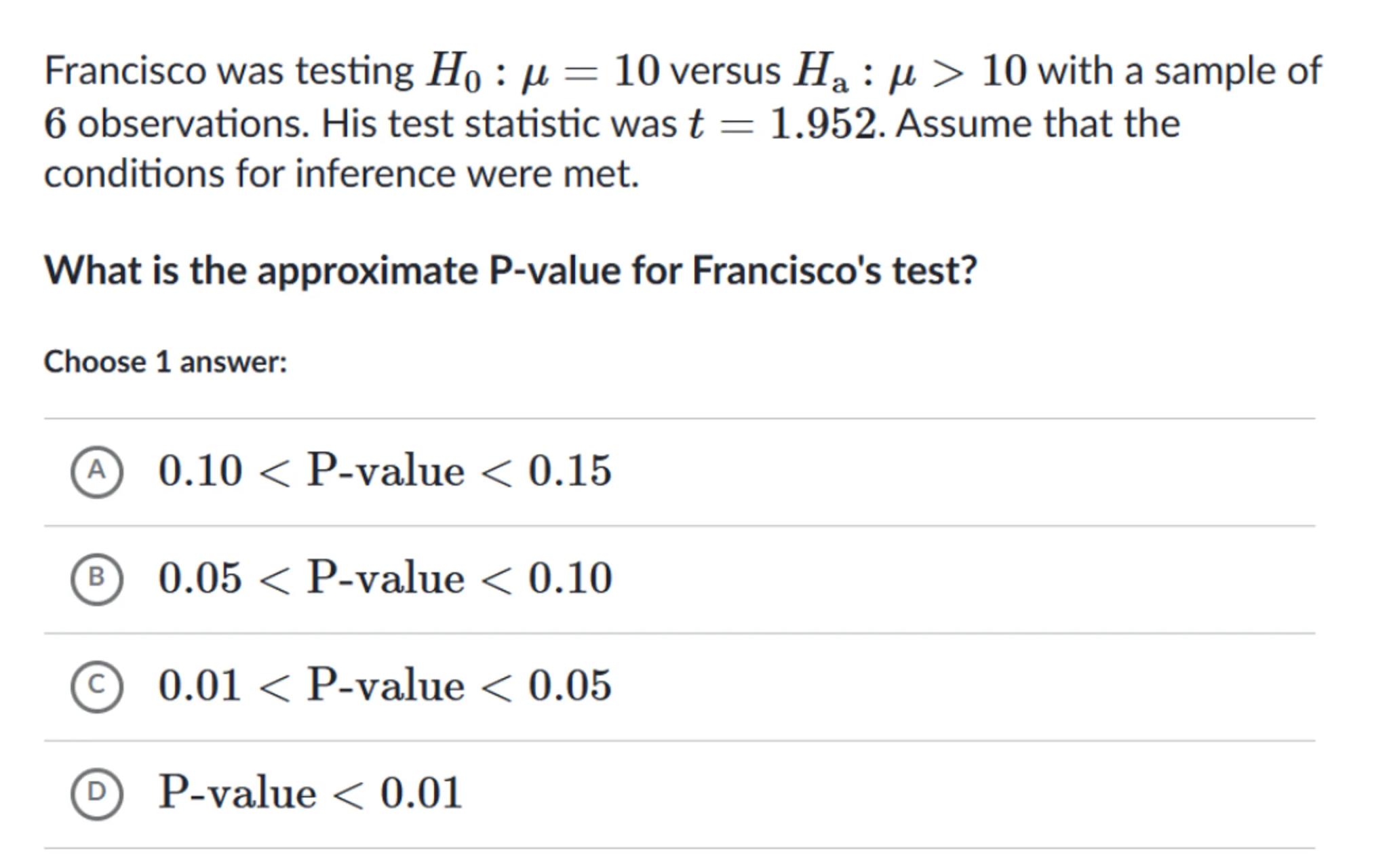 Francisco was testing versus with a sample of 6 observations. His test statistic was . Assume that the conditions for inference were met.