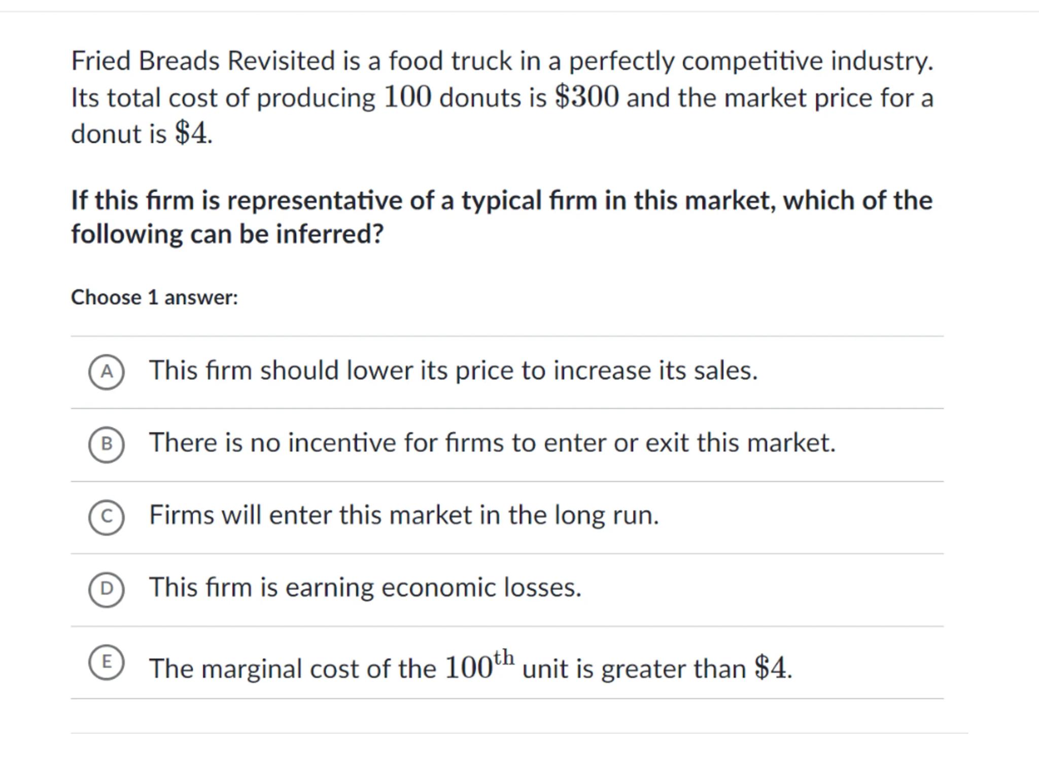 Fried Breads Revisited is a food truck in a perfectly competitive industry. Its total cost of producing 100 donuts is and the market price for a donut is .