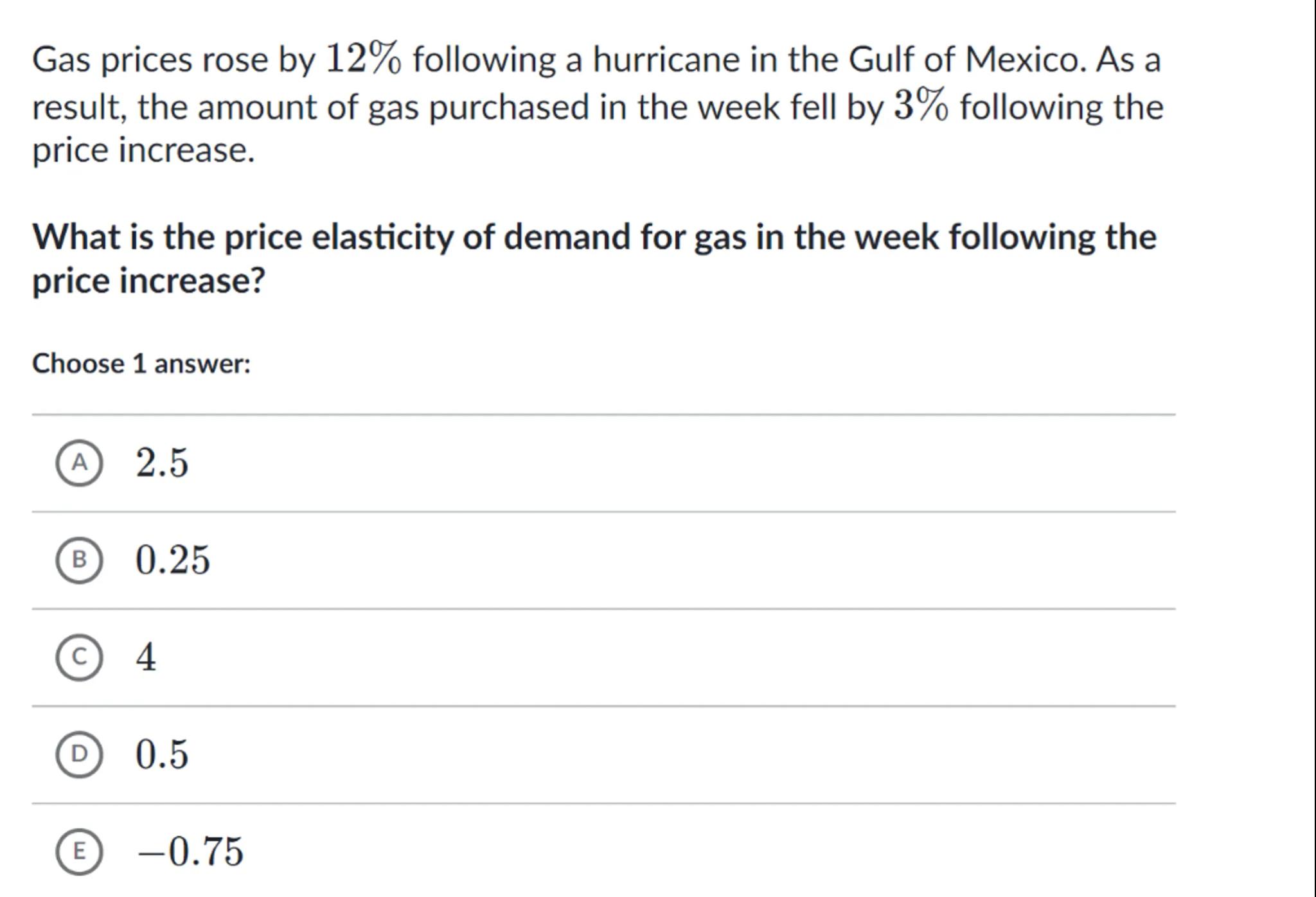 Gas prices rose by following a hurricane in the Gulf of Mexico. As a result, the amount of gas purchased in the week fell by following the price increase.