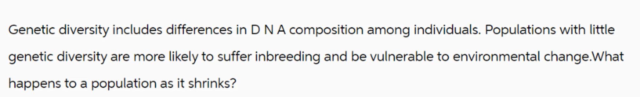 Genetic diversity includes differences in D N A composition among individuals. Populations with little genetic diversity are more likely to suffer inbreeding and be vulnerable to environmental change.What happens to a population as it shrinks?