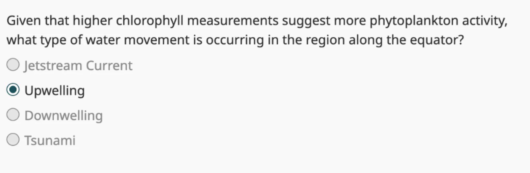 Given that higher chlorophyll measurements suggest more phytoplankton activity, what type of water movement is occurring in the region along the equator?