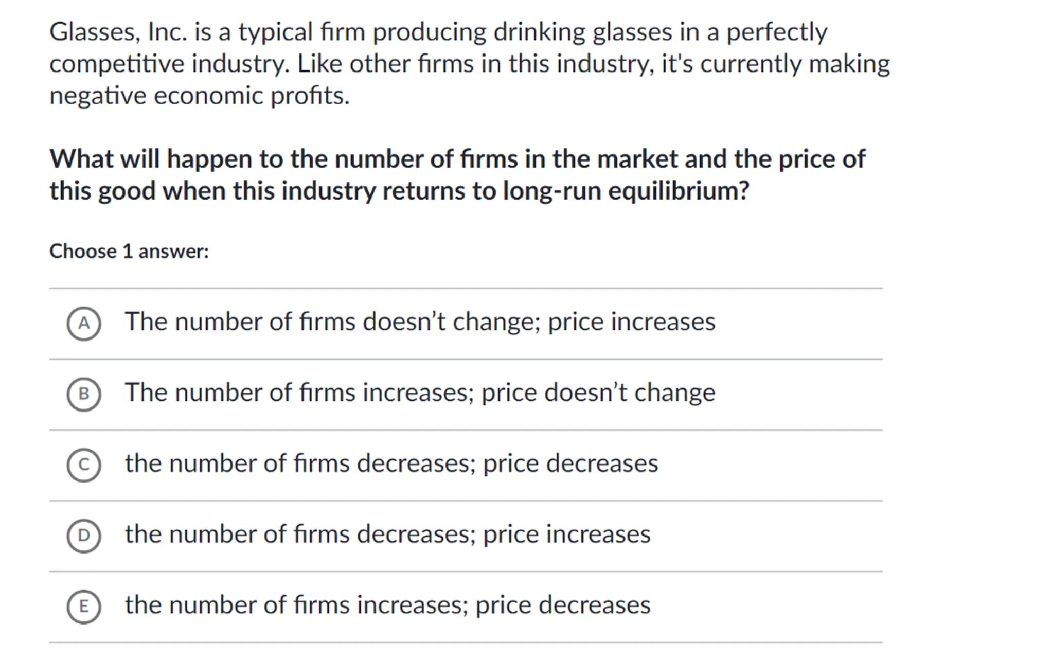 Glasses, Inc. is a typical firm producing drinking glasses in a perfectly competitive industry. Like other firms in this industry, it's currently making negative economic profits.