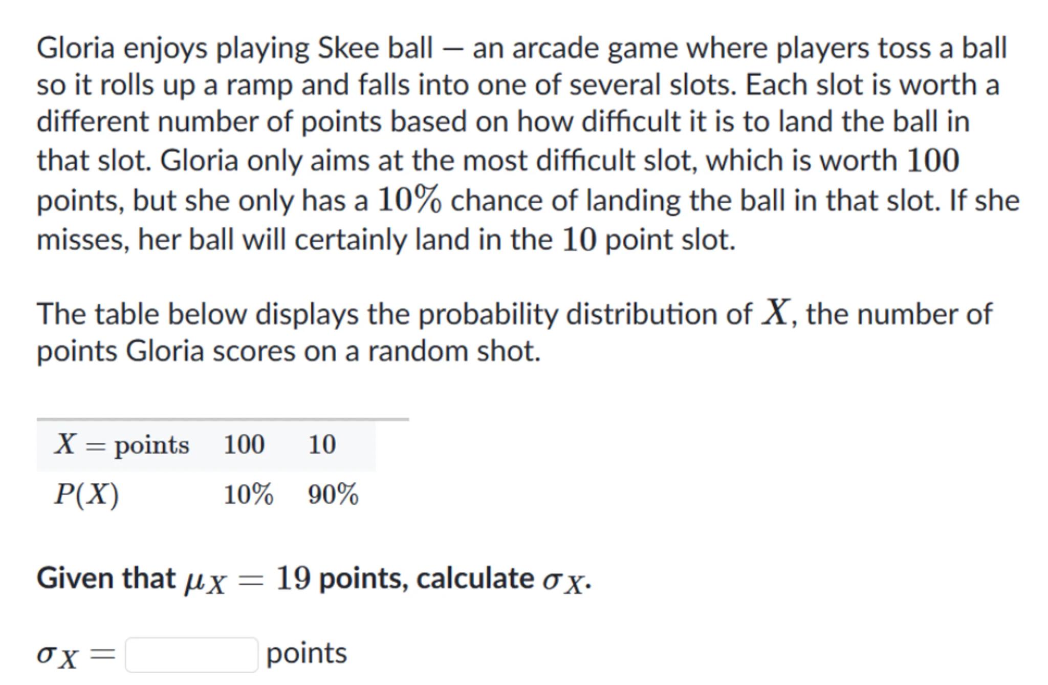Gloria enjoys playing Skee ball - an arcade game where players toss a ball so it rolls up a ramp and falls into one of several slots. Each slot is worth a different number of points based on how difficult it is to land the ball in that slot. Gloria only aims at the most difficult slot, which is worth 100 points, but she only has a chance of landing the ball in that slot. If she misses, her ball will certainly land in the 10 point slot.