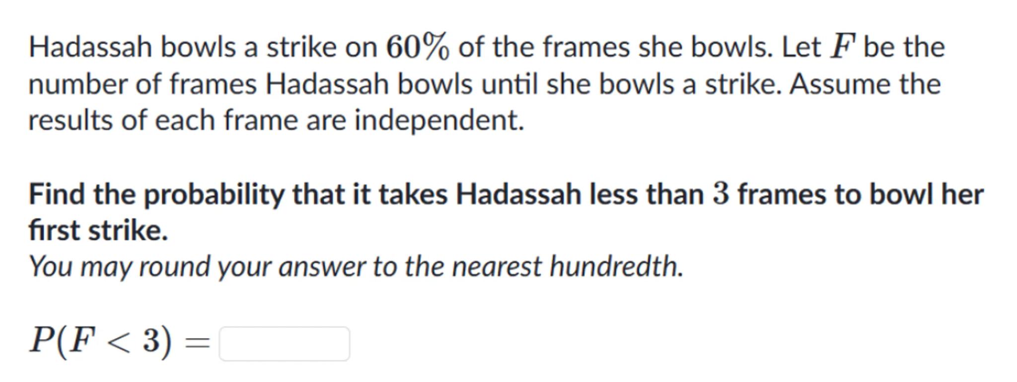 Find the probability that it takes Hadassah less than 3 frames to bowl her first strike.