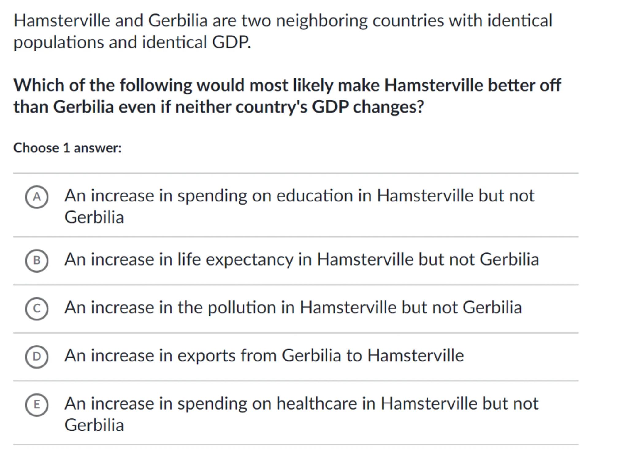 (A) An increase in spending on education in Hamsterville but not Gerbilia