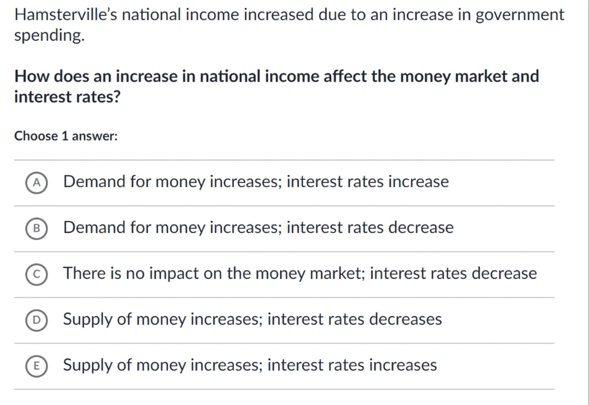 (E) Supply of money increases; interest rates increases