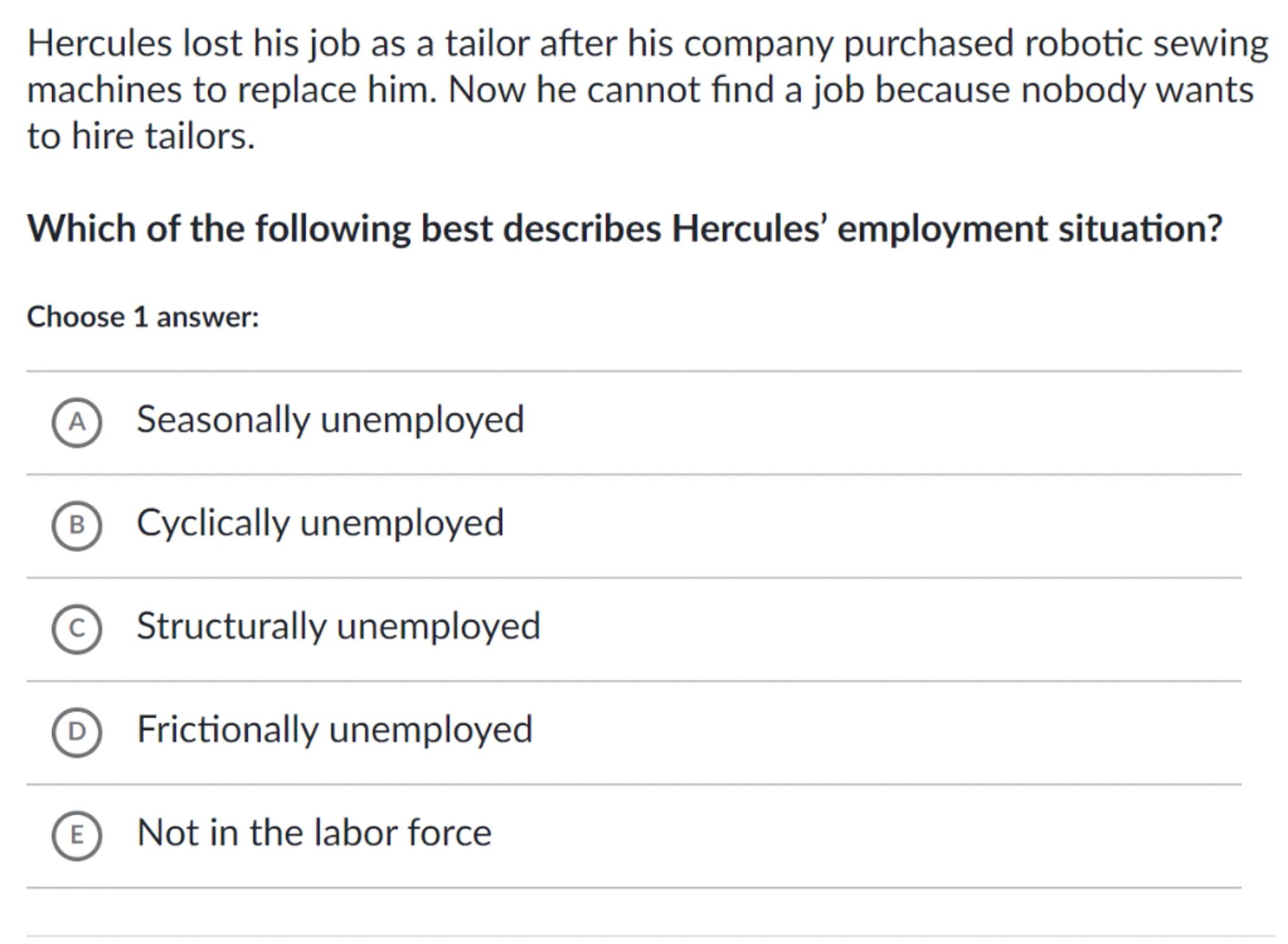 Hercules lost his job as a tailor after his company purchased robotic sewing machines to replace him. Now he cannot find a job because nobody wants to hire tailors.