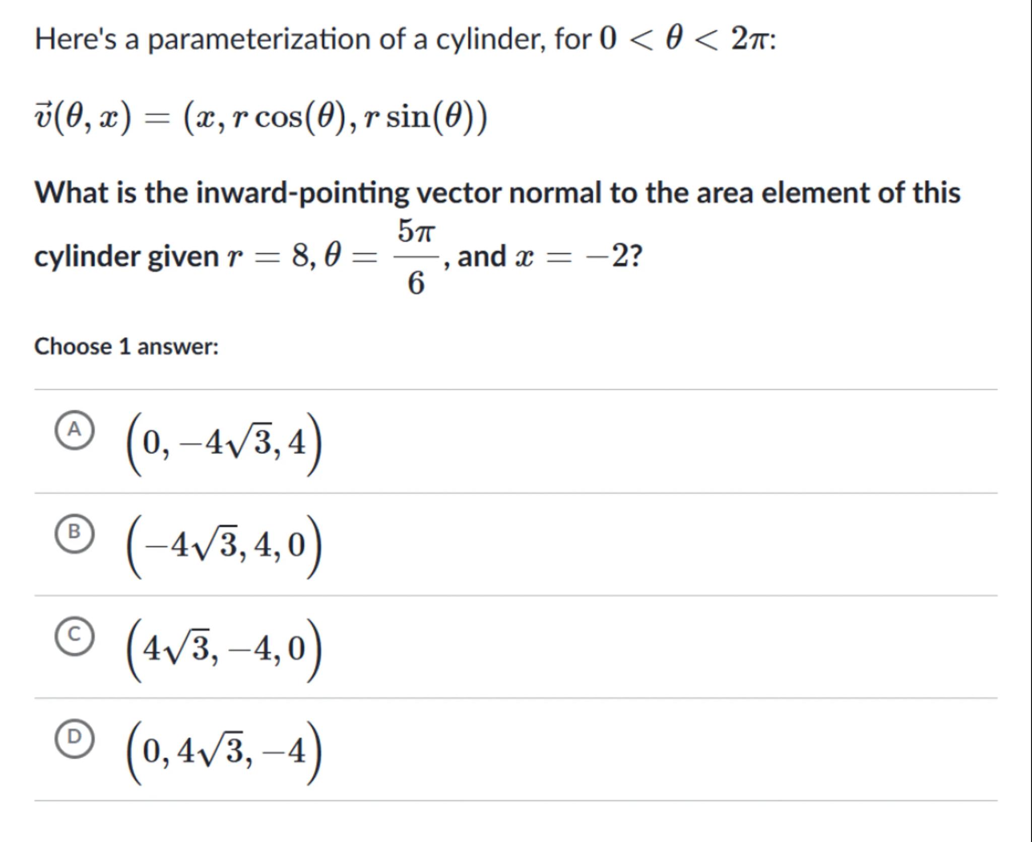 What is the inward-pointing vector normal to the area element of this cylinder given , and ?