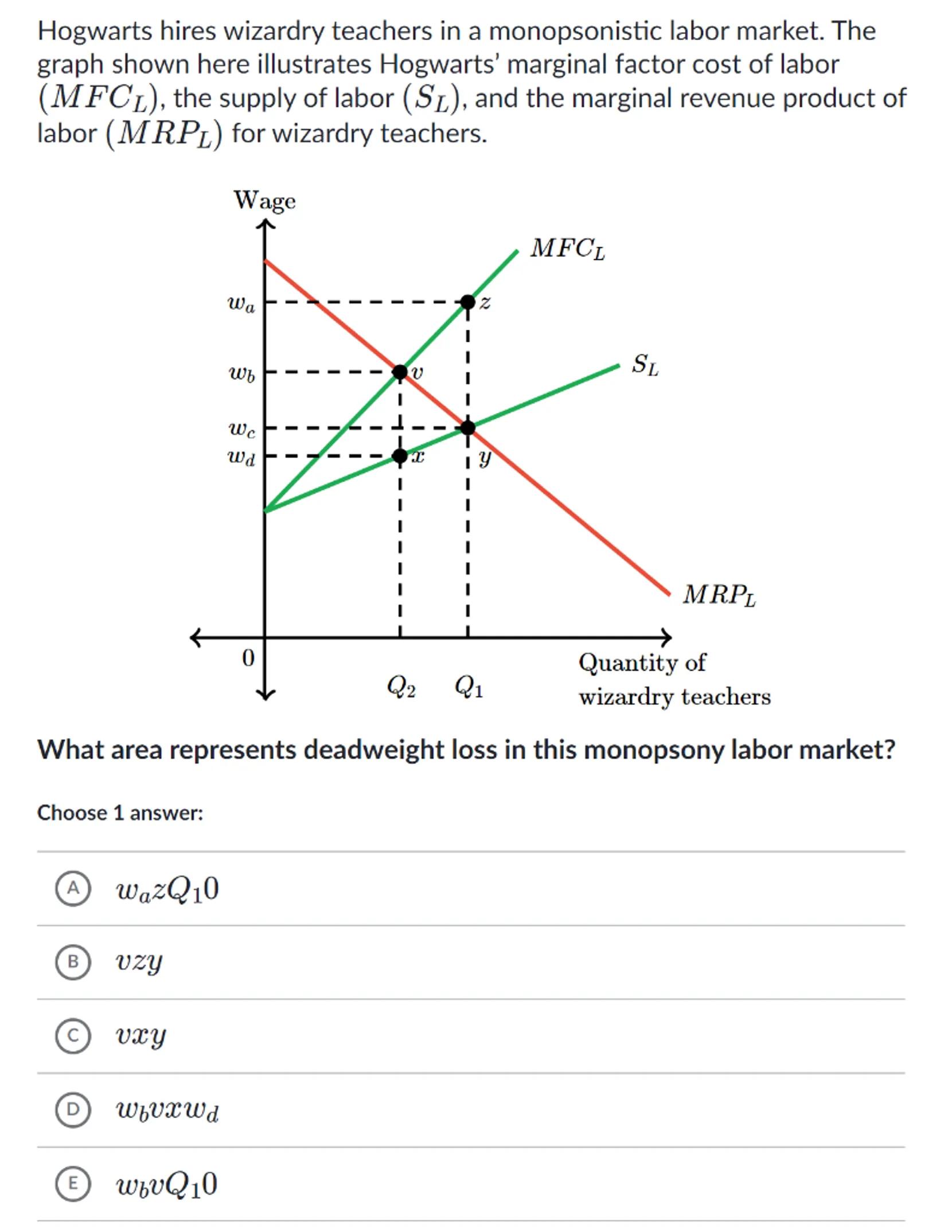 Hogwarts hires wizardry teachers in a monopsonistic labor market. The graph shown here illustrates Hogwarts' marginal factor cost of labor , the supply of labor , and the marginal revenue product of labor for wizardry teachers.