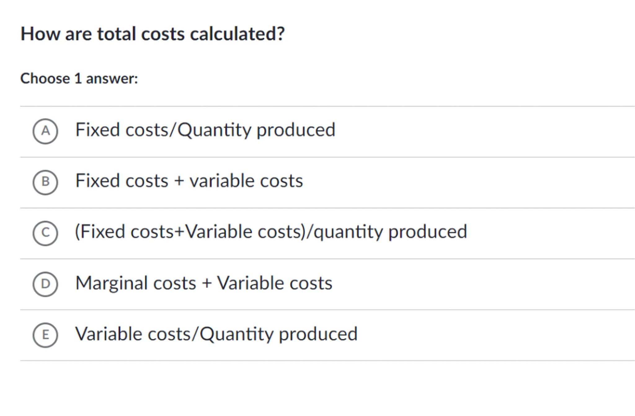 (C) (Fixed costs+Variable costs)/quantity produced