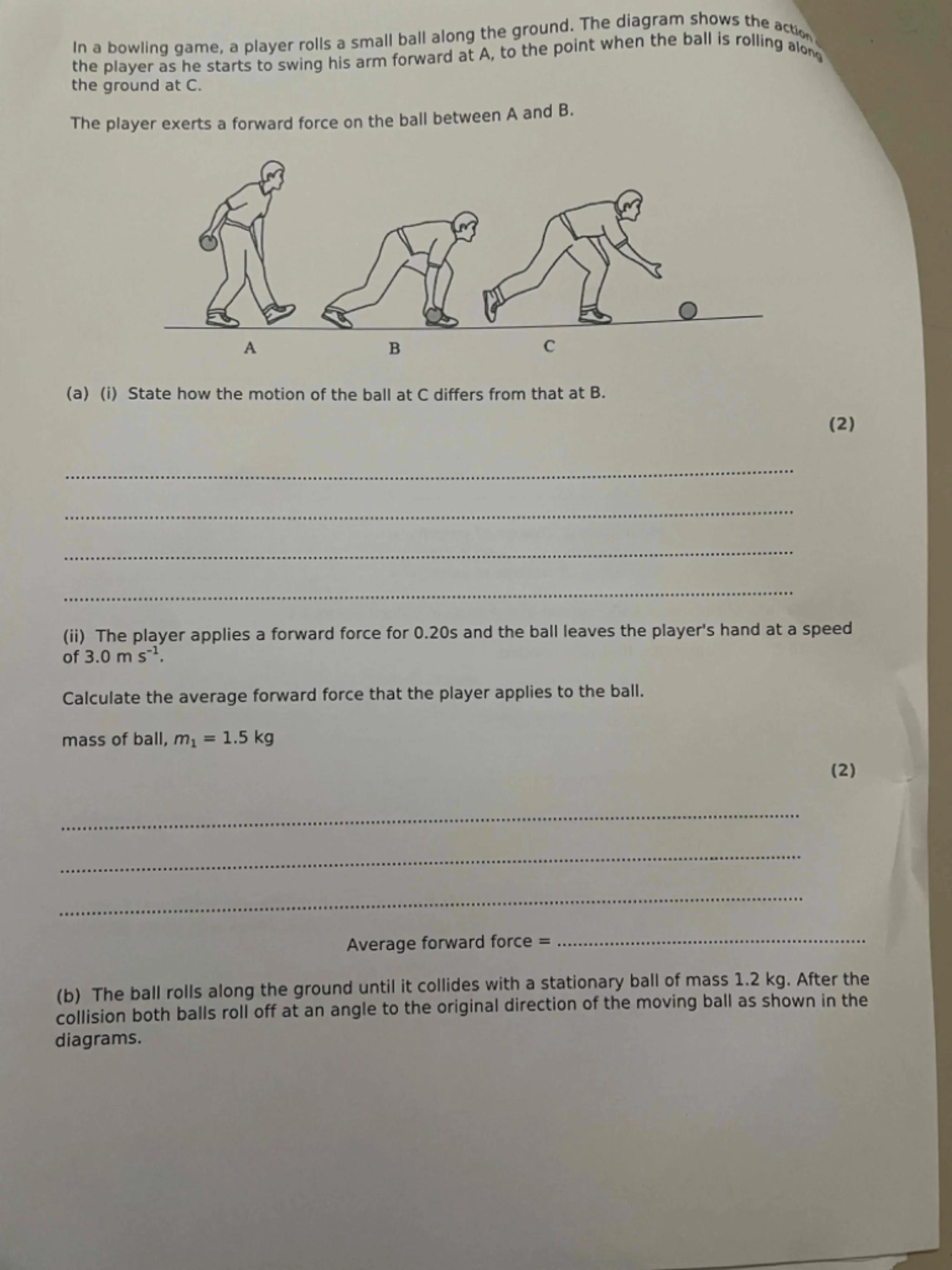 In a bowling game, a player rolls a small ball along the ground. The diagram shows the action the player as he starts to swing his arm forward at , to the point when the bail is rolling along the ground at C .