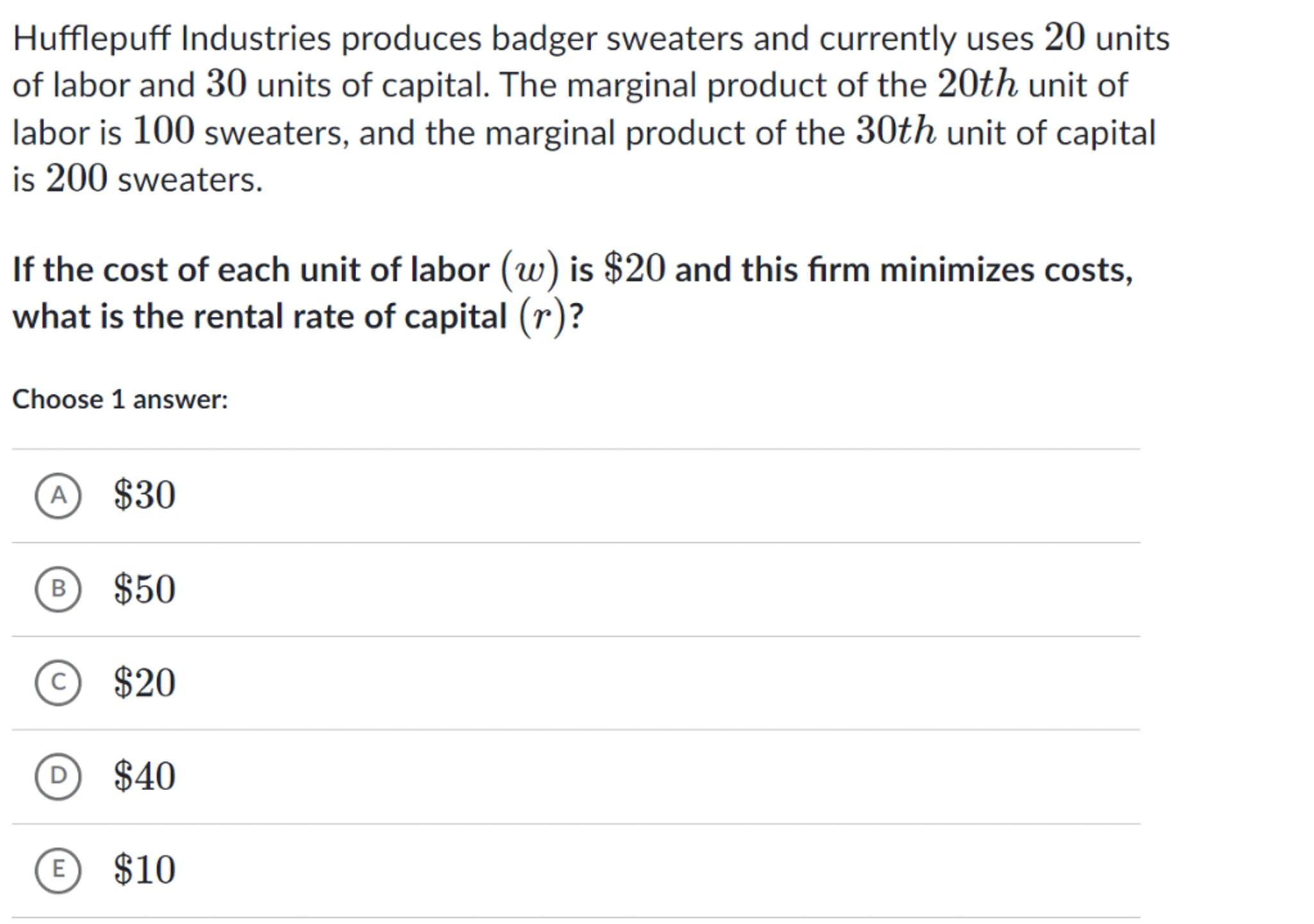 Hufflepuff Industries produces badger sweaters and currently uses 20 units of labor and 30 units of capital. The marginal product of the unit of labor is 100 sweaters, and the marginal product of the unit of capital is 200 sweaters.