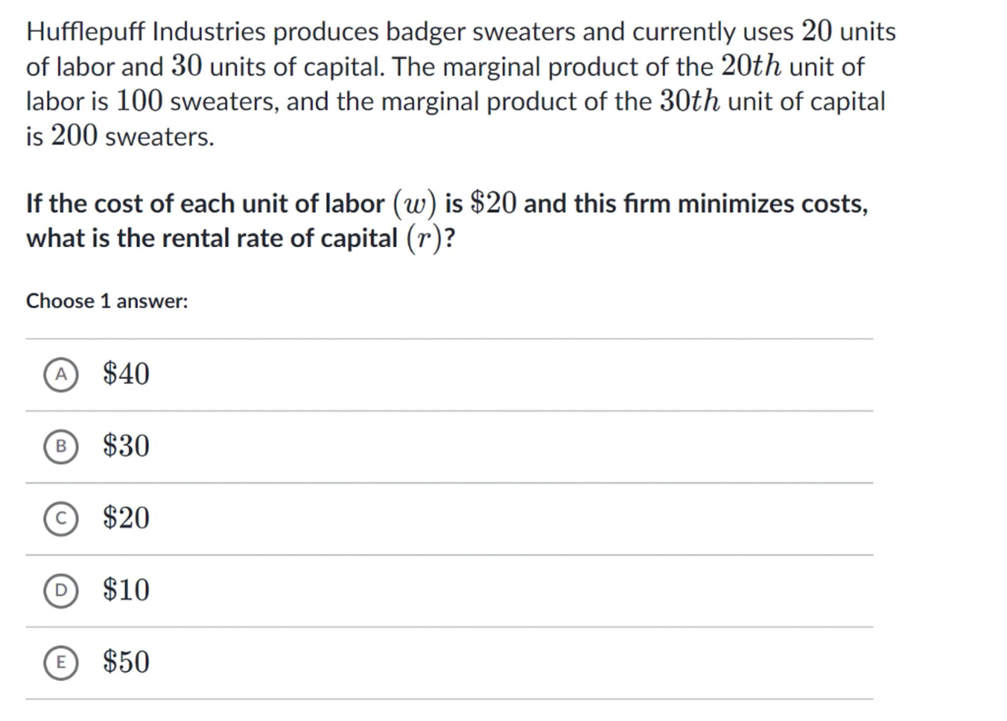 Hufflepuff Industries produces badger sweaters and currently uses 20 units of labor and 30 units of capital. The marginal product of the unit of labor is 100 sweaters, and the marginal product of the unit of capital is 200 sweaters.