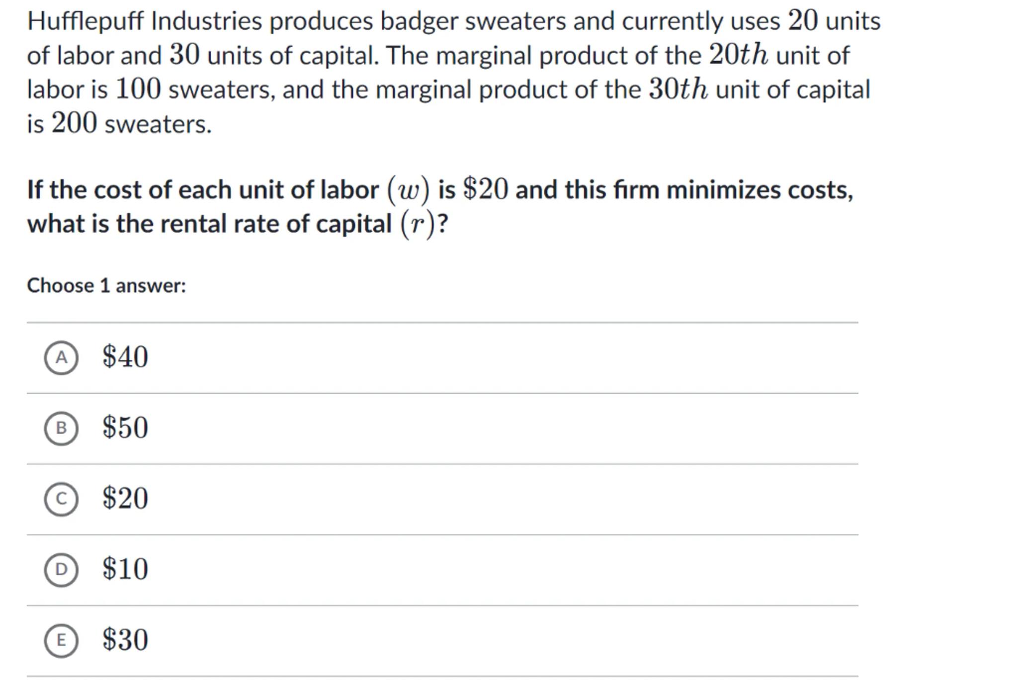 Hufflepuff Industries produces badger sweaters and currently uses 20 units of labor and 30 units of capital. The marginal product of the unit of labor is 100 sweaters, and the marginal product of the unit of capital is 200 sweaters.