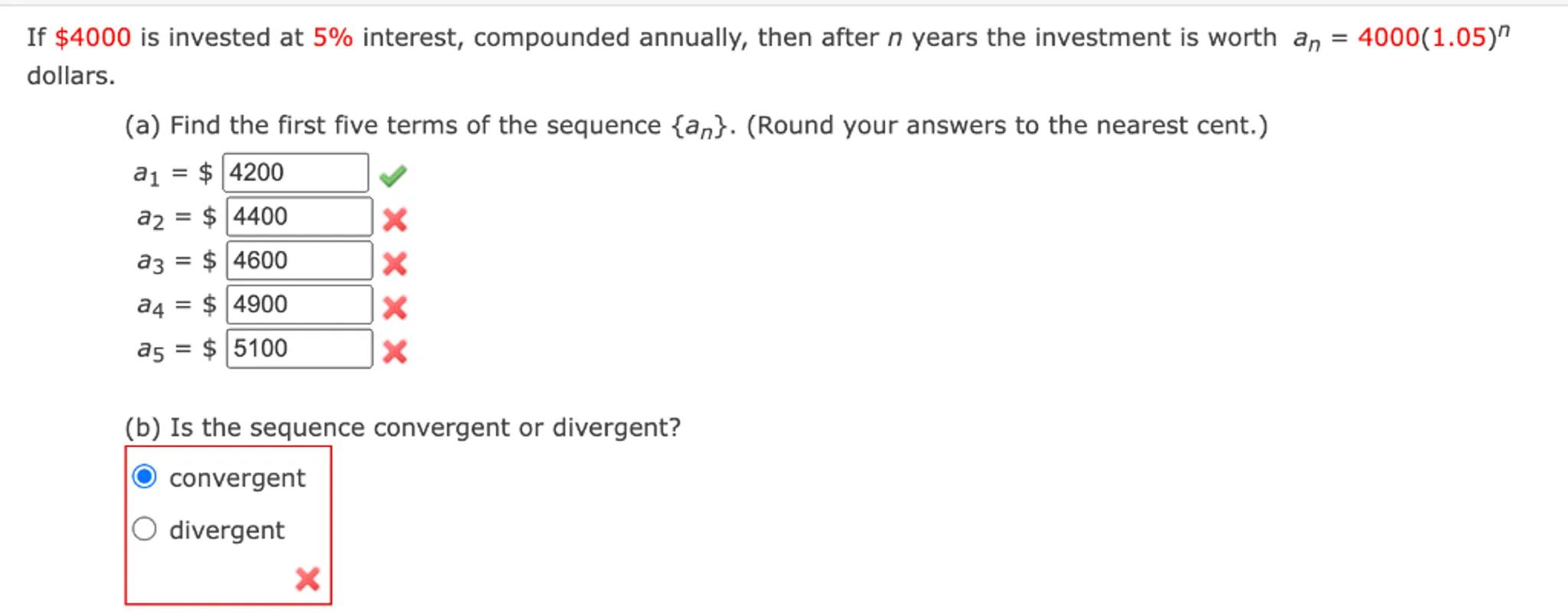 (a) Find the first five terms of the sequence . (Round your answers to the nearest cent.)