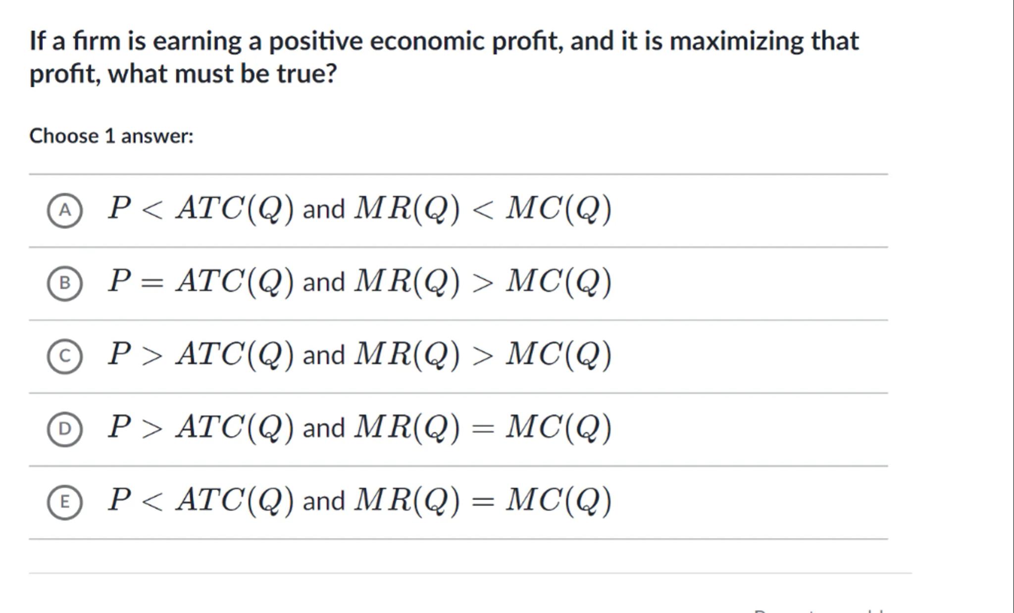 If a firm is earning a positive economic profit, and it is maximizing that profit, what must be true?