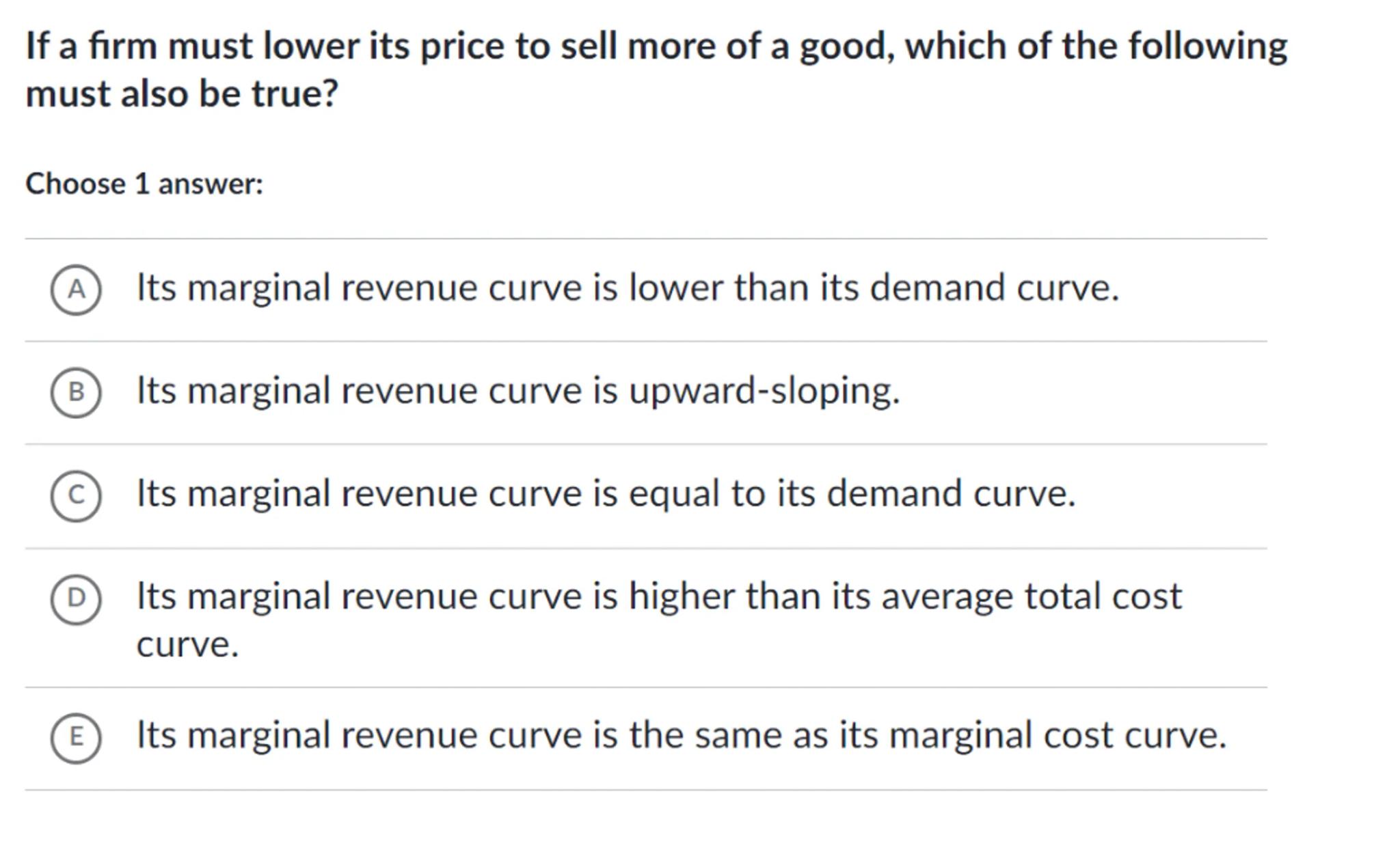 If a firm must lower its price to sell more of a good, which of the following must also be true?