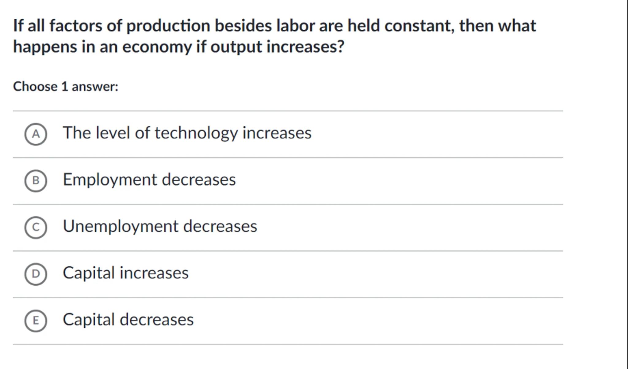 If all factors of production besides labor are held constant, then what happens in an economy if output increases?